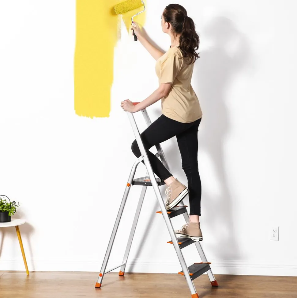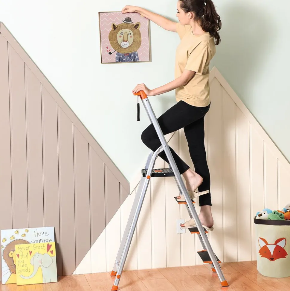 CE QUE VOUS OBTENEZ : Une échelle pliable et multifonctionnelle en aluminium à 6 marches adaptée à divers usages. Les marches sont rugueuses et équipées de raccords en plastique orange, à la fois antidérapantes et jolies