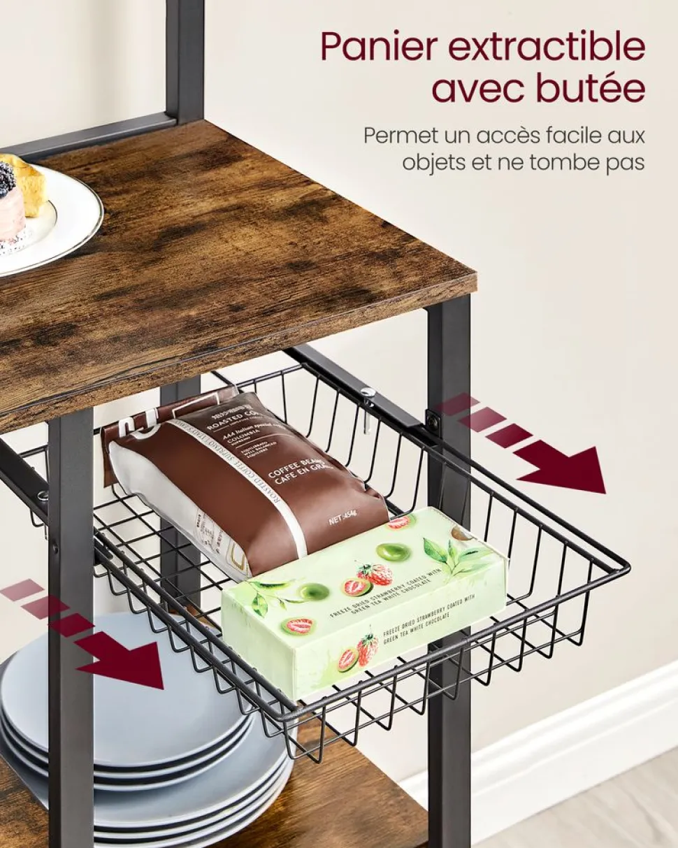 [Grand espace] Placez des épices sur l’étagère du haut. Suspendez des poêles et des spatules sur les 12 crochets. Posez la cafetière, le grille-pain et le micro-ondes sur la table. Organisez votre cuisine et préparez à manger en toute simplicité[Support aimanté pour couteaux et porte-rouleau] Grâce à sa force d’adhérence de 3 kg, gardez vos couteaux à portée de main en toute sécurité et au sec. Retirez et changez facilement les papiers absorbants avec le support pour essuie-tout[2 méthodes d’installation] Les pièces numérotées et les instructions illustrées vous aident à monter cette étagère sans effort. Vous pouvez changer les positons des étagères, du porte-rouleau ou du support magnétique, que ce soit à gauche ou à droite[Panier extractible pratique] Vous pouvez ranger vos ustensiles de cuisine dans le panier sous la table, le panier conçu comme un tiroir offre un accès facile et est équipé de butées pour éviter de tomber lors de son utilisation[Stable et sûr] Avec les panneaux d’aggloméré de qualité et la structure en acier, cette étagère est stable. Les pieds réglables améliorent la stabilité. Le dispositif anti-basculement rend cette
