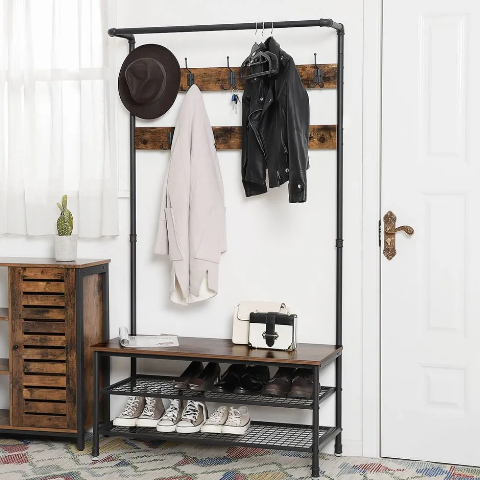 Conçu dans un design industriel tendance avec des éléments en bois rustique, ce porte-manteau est particulièrement adapté aux grandes pièces ou aux pièces ouvertes qui ne sont pas encore trop encombrées par d’autres meubles. Placez ce vestiaire dans le couloir pour accrocher les vestes et les manteaux et pour porter vos chaussures confortablement.