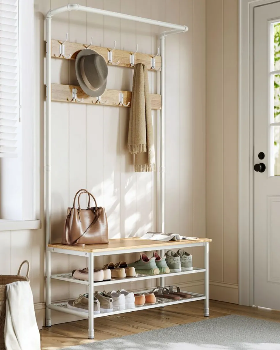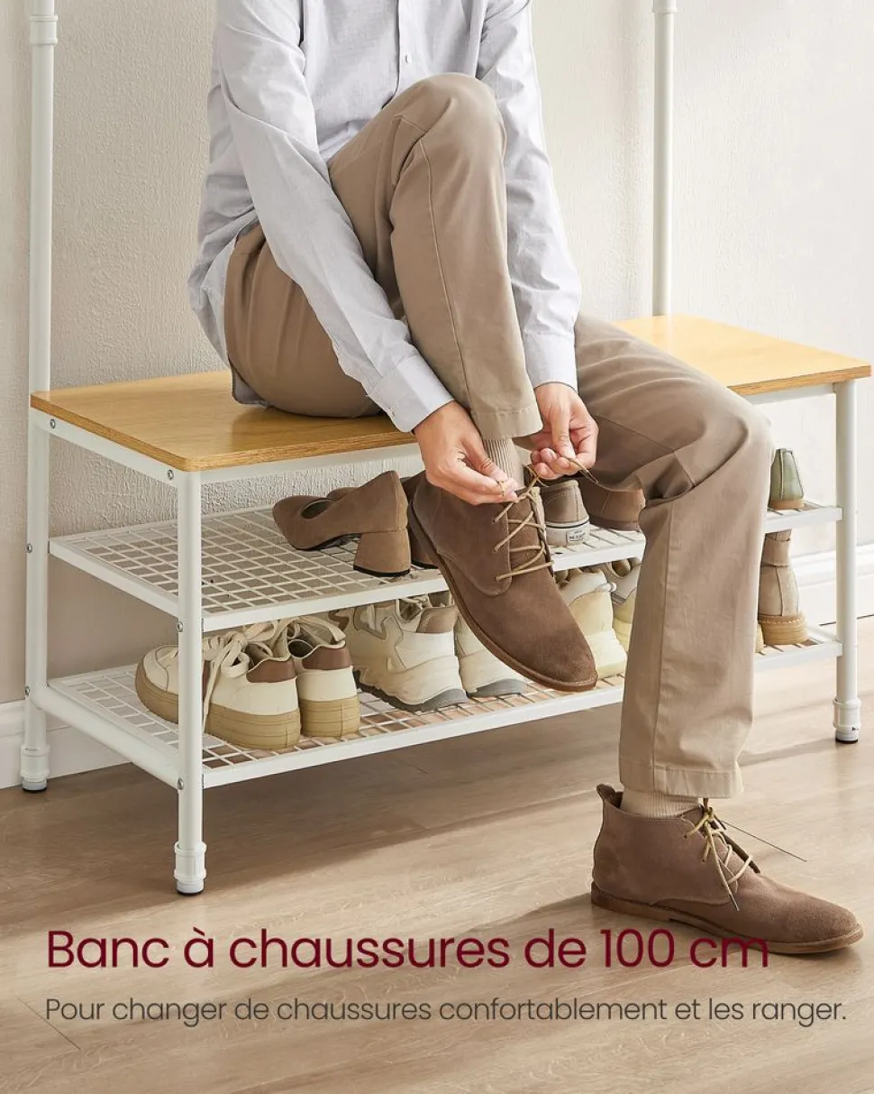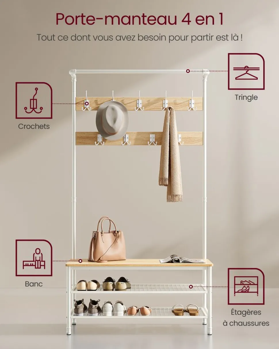 TOUT CE DONT VOUS AVEZ BESOIN: Après votre retour à la maison à la fin de la journée, accrochez votre manteau, votre chapeau et vos foulards à l’un des 4 crochets doubles ou des 5 crochets triples, asseyez-vous sur le banc pour enlever vos chaussures et placez-les sur les étagères de rangement en treillis