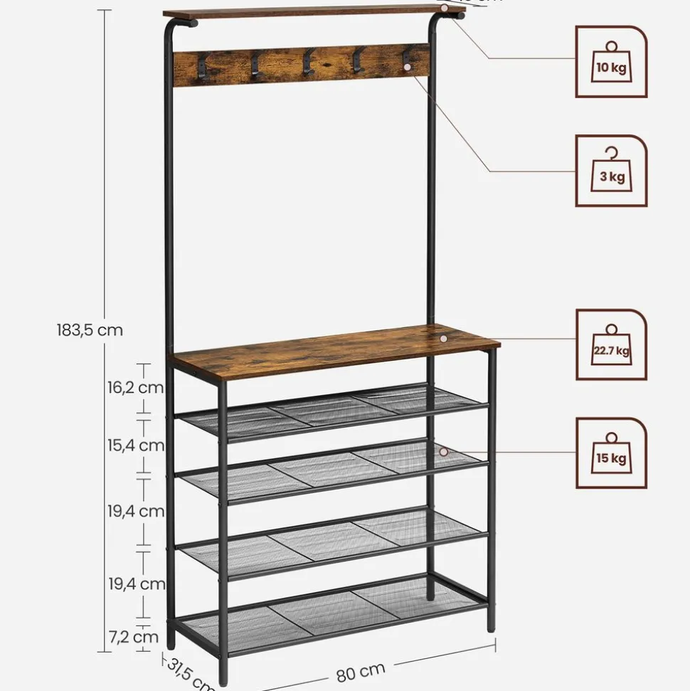 Rangement tout-en-un : Rangez vos chaussures et vos sacs sur l’étagère à 5 niveaux, accrochez vos manteaux sur les 5 crochets doubles et posez des décorations sur la planche du haut. Ce porte-manteau offre un grand espace pour tous vos objets