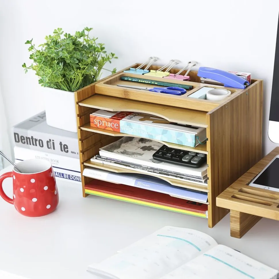 Cet organisateur en bambou SONGMICS est une merveilleuse solution pour garder votre bureau organisé ! Fabriqué en bambou naturel, il est solide et facile à nettoyer.De plus, les 5 tablettes amovibles vous permettent de régler la distance entre elles selon votre besoin. Ce produit peut être utilisé horizontalement ou verticalement. Les recoins et les fentes sont polis soigneusement pour une utilisation sécuritaire. N’attendez plus et profitez de cet organisateur pratique et durable ! Donnez un lieu privilégié à vos papiers importants.