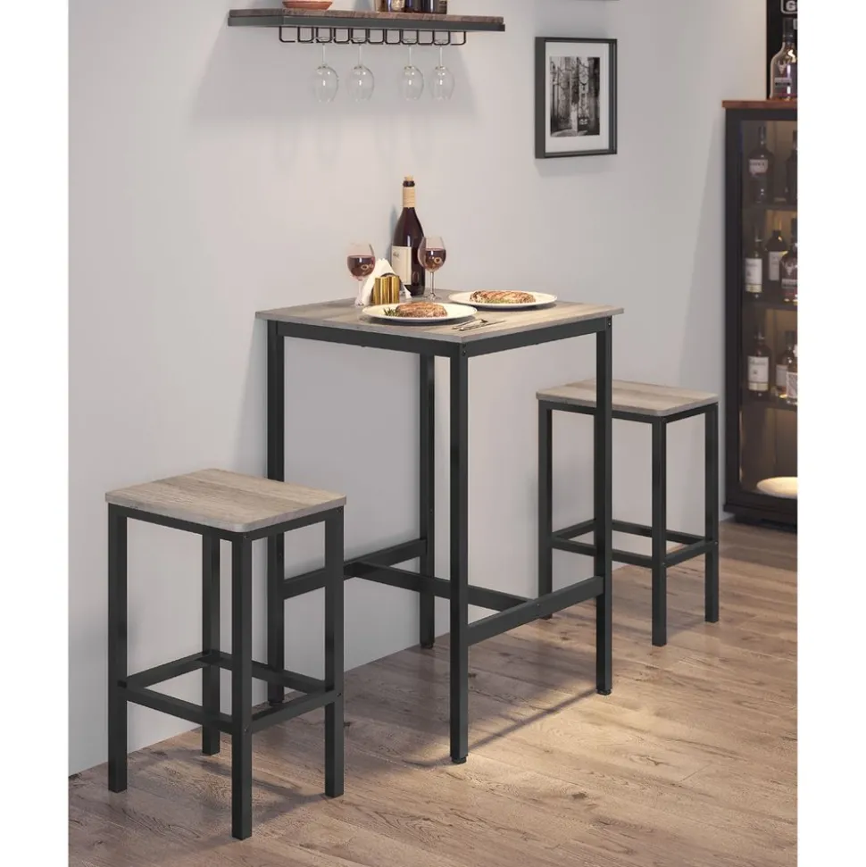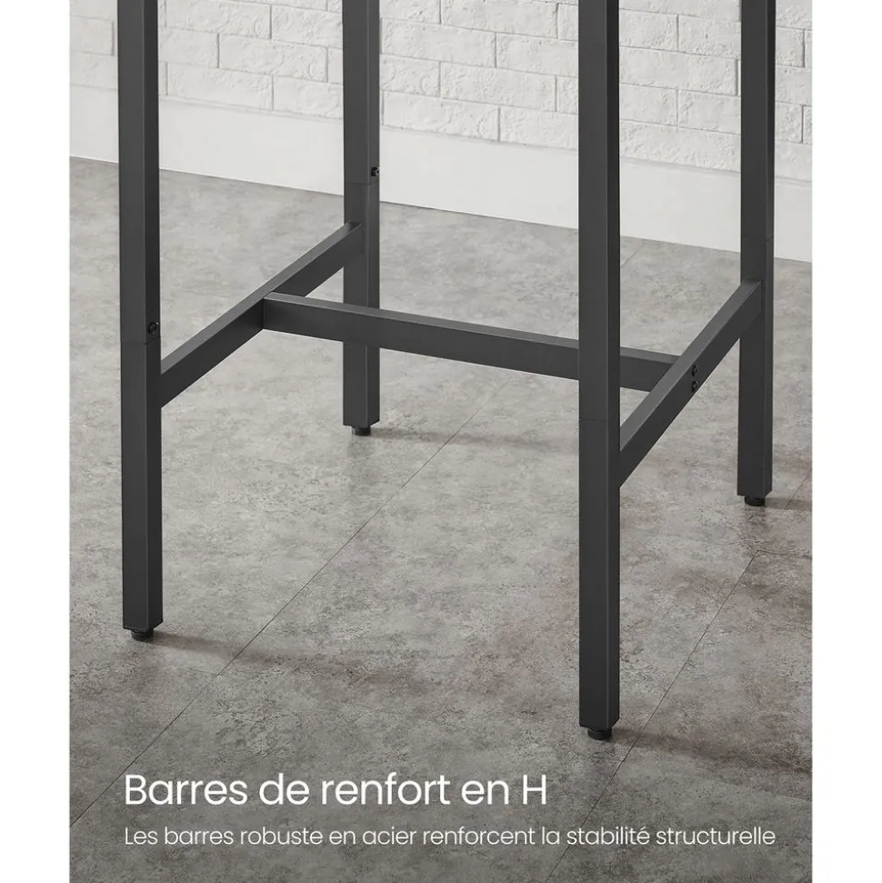 [Solide et résistant] Avec une planche en panneau d’aggloméré et un cadre en acier, cette table de salle à manger est robuste et stable, elle supporte jusqu’à 100 kg[Polyvalent] Cette table carrée peut servir de table de petit-déjeuner, de table à manger ou de mini-bar à café. Avec une taille de 60 x 60 x 92 cm, elle se glisse facilement dans les petites cuisines, dans les coins ou près de la fenêtre[Commodités supplémentaires] La barre transversal du bas offre un endroit confortable pour reposer vos pieds. Les pieds réglables assurent une bonne stabilité même sur un sol légèrement irrégulier et protègent le sol des rayures[Style industriel, recommendation des tabourets] Cette table haute apporte une touche industrielle à votre intérieur. Il est conseillé de vous équiper de 2 tabourets de bar (non inclus) d’une hauteur de 61 à 66 cm qui se glissent facilement sous la table[Assemblage simplifié] Pas doué pour le montage ? Ne vous inquiétez pas ! Les instructions illustrées et les pièces numérotées sont là pour vous aider à assembler cette table de bar en 15 minutes environ