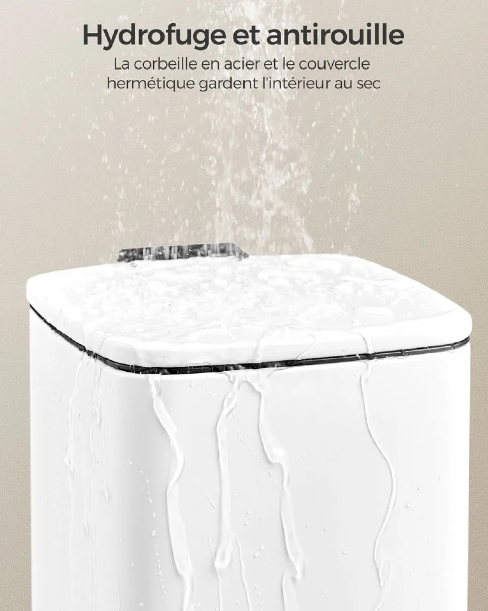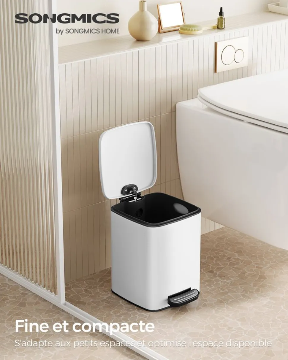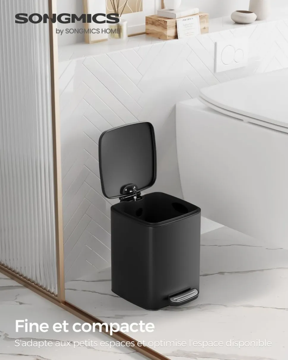 propos de cet article[Solution pour économiser l’espace] Avec un profil compact mesurant 23,9 x 19,3 x 25,5 cm (L x l x H), cette poubelle de salle de bain de 6L s’adapte parfaitement aux petits espaces et offre une grande capacité tout en occupant un espace minimal au sol[Étanche et sans odeur] La corbeille compacte est fabriquée en acier antirouille avec un couvercle hermétique qui empêche l’eau de couler par terre, elle assure que le contenu reste sec et isole les mauvaises odeurs. Idéale pour les salles de bain humides[Fermeture en douceur et ouverture constante] Cette poubelle à pédale est équipée d’un couvercle qui se ferme en silence et en douceur. Vous pouvez également maintenir le couvercle ouvert pour jeter facilement les déchets lorsque nécessaire[Seau amovible avec poignée pratique] Il suffit de soulever le seau interne à l’aide des poignées pour le vider ou le nettoyer facilement. La poignée arrière permet un déplacement facile[Ouverture mains libres] Le couvercle de la poubelle peut être ouvert avec la pédale, pour jeter rapidement les déchets sans avoir à toucher la poubelle avec les mains