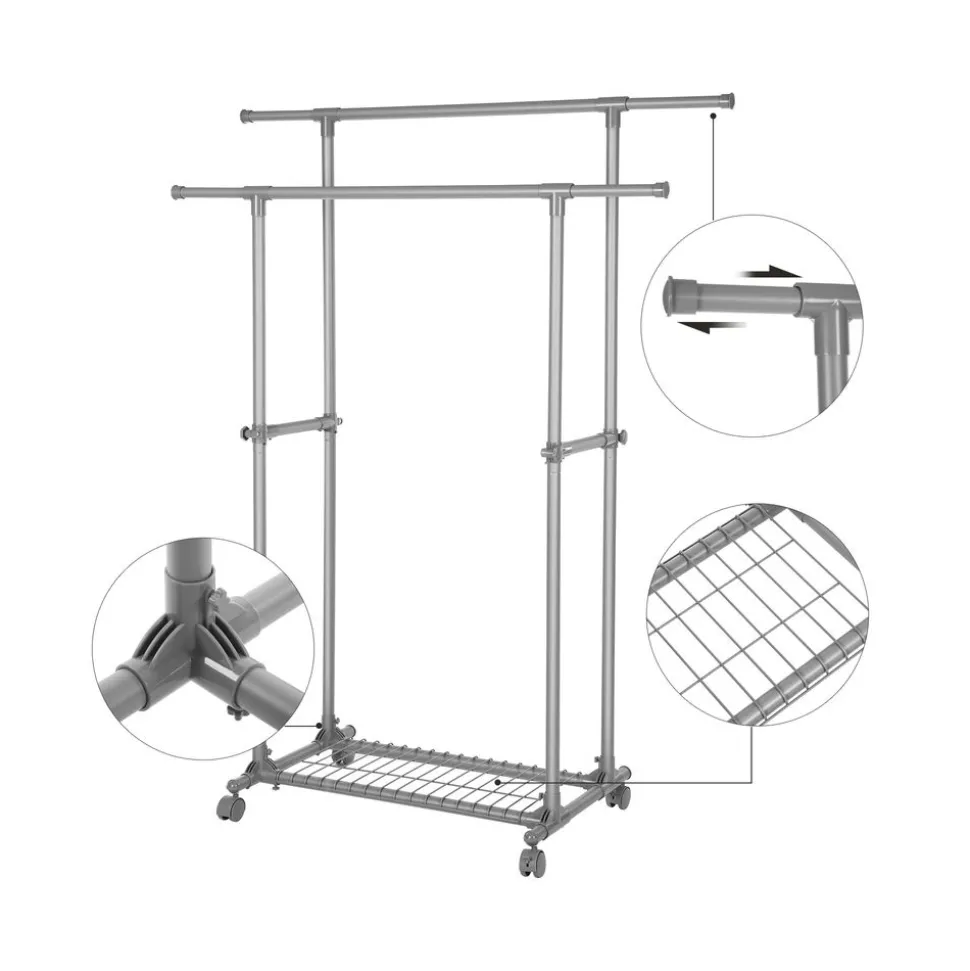UN PORTANT SOLIDE : Les barres en acier au carbone de 29 mm de diamètre assurent une capacité de charge de 70 kg (35 kg/barre), ce qui lui permet de supporter même les manteaux d’hiver les plus lourds