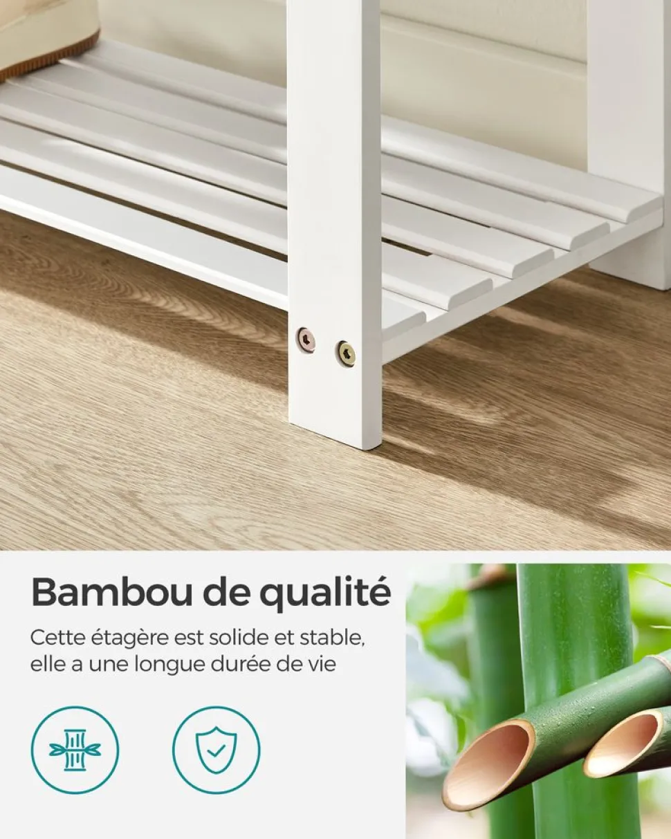 [Élégant et pratique] Cet ensemble porte-manteau et banc à chaussures est pratique et esthétique, et permet de tout organiser. Ne vous souciez pas des couleurs, elles sont coordonnées avec tous les styles d’intérieur ![Meuble d’entrée 4 en 1 avec banc] Cet ensemble comprend une étagère pour les bibelots, 5 crochets doubles pour suspendre les sacs, vêtements et parapluies et un banc avec 2 étagères inférieurs. Avec lui, vous avez tout ce qu’il vous faut pour sortir ![Soutien fiable] Fabriqué en bambou naturel, le banc à chaussures est conçu pour une durabilité à long terme. Il peut supporter jusqu’à 136 kg et chaque étagère peut accueillir facilement 3 paires de chaussures[Facile à assembler] Grâce à sa structure simple, à son pré-assemblage et aux instructions faciles à suivre, ce meuble d’entrée avec banc peut être monté en un rien de temps[Polyvalent] Utilisés ensemble ou séparément, le porte-manteau et le banc à chaussures peuvent être placés dans différentes pièces comme l’entrée, le salon ou la chambre, s’adaptant à vos préférences et s’harmonisant avec n’importe quel espace