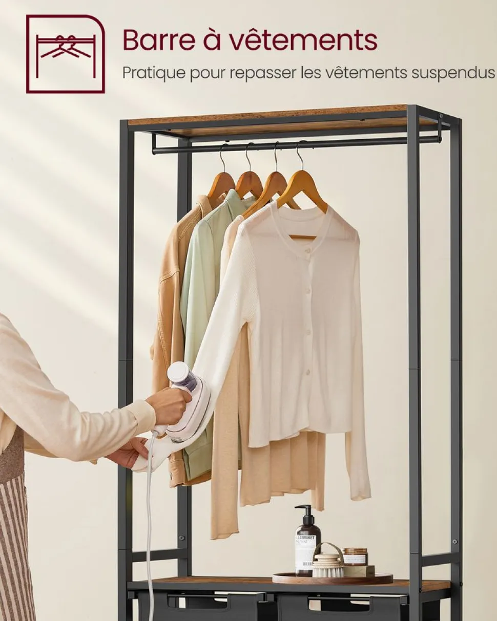 [Double panier à linge, tri par type] Ce panier à linge a un volume total de 92L (46L par sac), vous avez suffisamment d’espace pour le linge sale d’une semaine de toute la famille. Avec 2 compartiments, pratique pour trier le linge[Plateau pratique] Le plateau au-dessus des sacs vous offre un espace supplémentaire pour les détergents et les adoucissants ; il sert également de support pratique sur lequel vous pouvez plier vos vêtements[Avec porte-serviettes] Le porte-serviettes avec 5 crochets sur le dessus du porte-linge est parfait pour suspendre des serviettes et des couvertures ; il y a également une étagère de rangement en haut[Robuste et stable] Grâce au tube de 20 mm et au panneau d’aggloméré de 20 mm, le plateau au milieu supporte jusqu’à 90 kg. Les pieds réglables assurent une bonne stabilité, le kit anti-basculement renforce la stabilité[Sacs amovibles et résistants à l’eau] Les sacs de rangement pour le linge sont amovibles et dotés d’un scratch, ce qui permet de les emmener facilement vers la machine à laver ; fabriqués en tissu Oxford de qualité, ils sont également résistants à l’eau