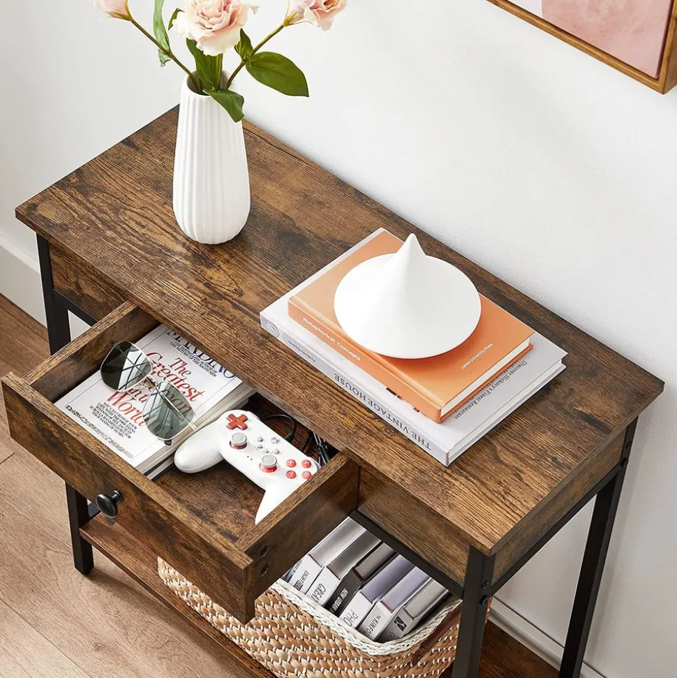 Le confort vient, le désordre disparaît : Placez vos photos, plantes et clés sur le dessus et vos portefeuilles et courriers dans le tiroir. L’étagère du bas accueille des objets plus grands comme des boîtes de rangement