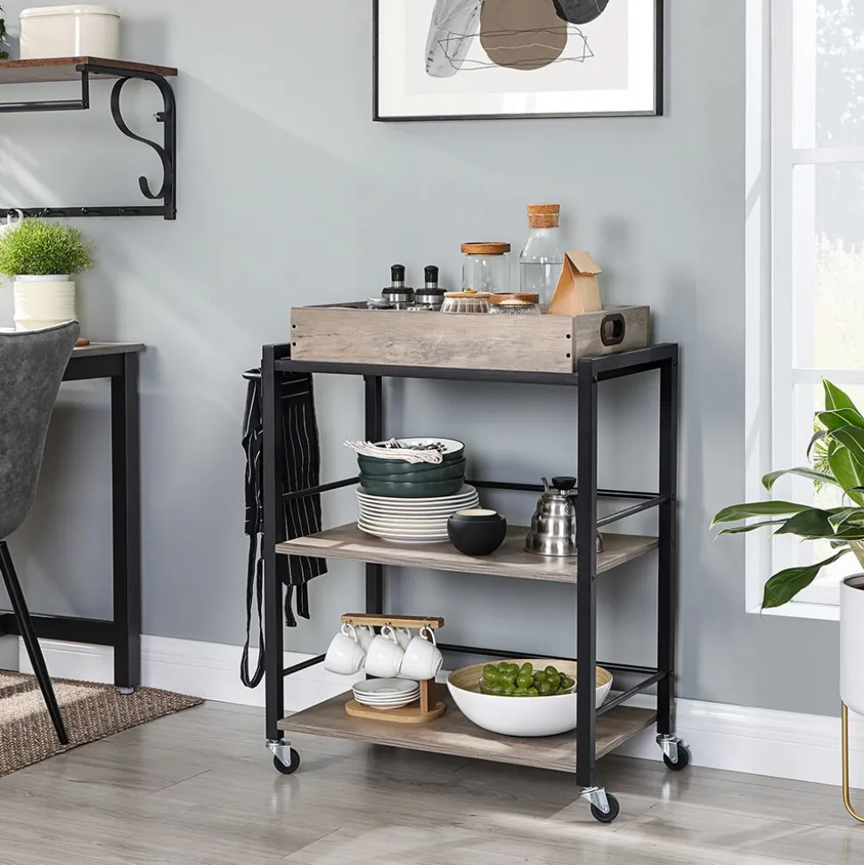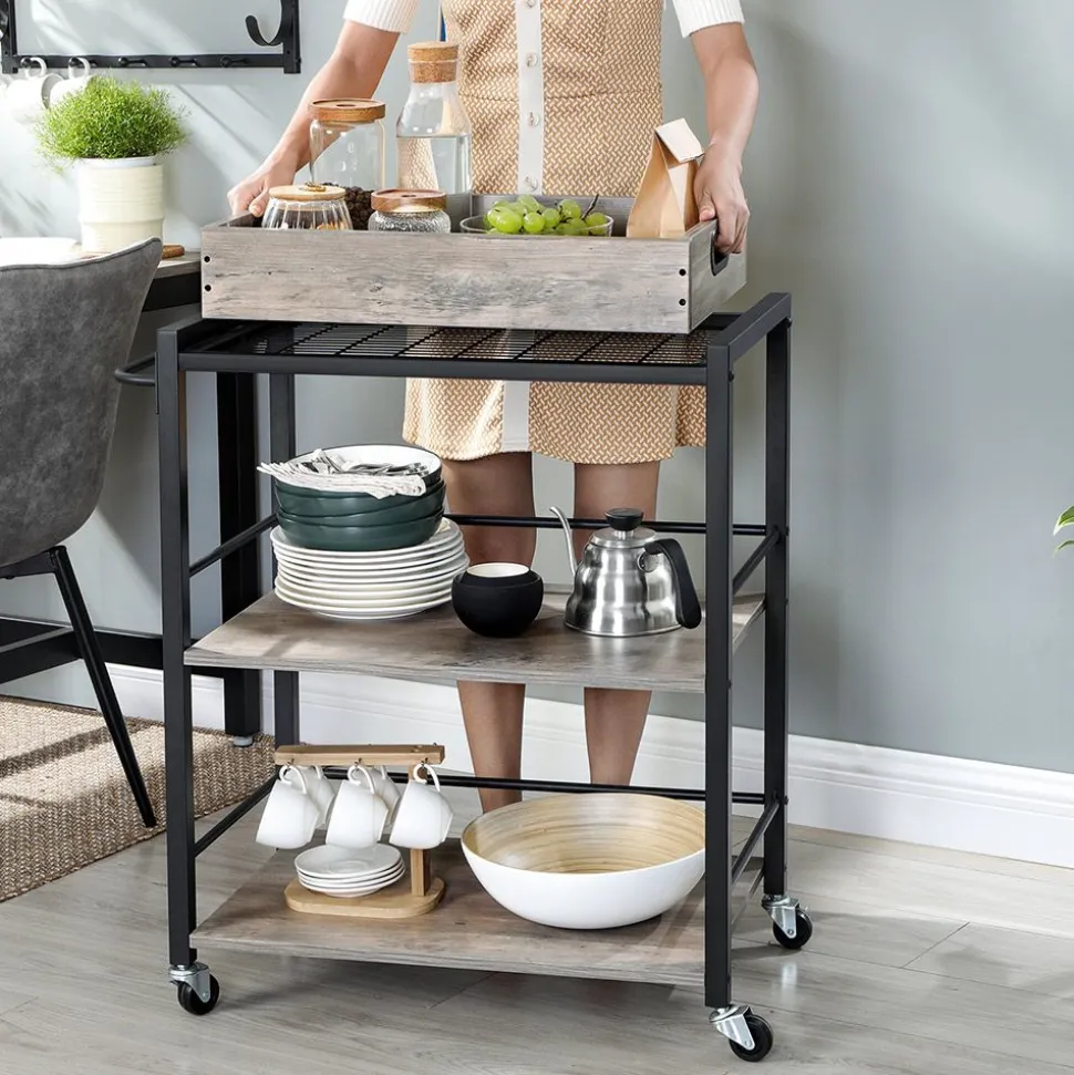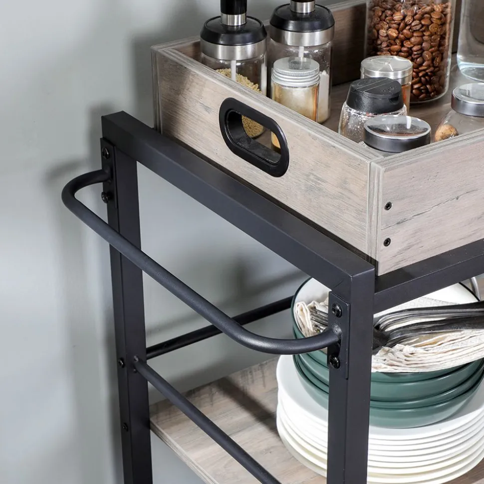 UN SERVICE 20/20 : Si vous aimez surprendre vos proches avec vos plats délicieux mais que votre plan de travail est souvent trop petit, ce chariot de cuisine avec un mélange de grège et de noir élégant vous aide à renforcer votre talent culinaire