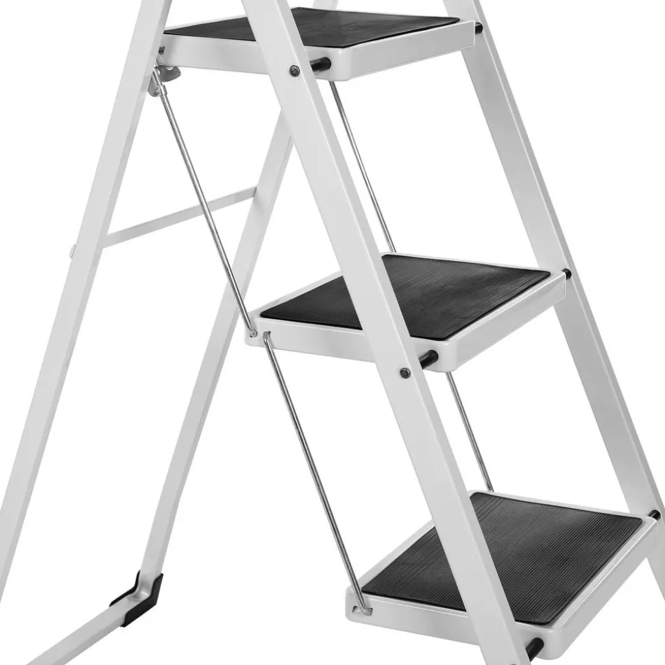 La stabilité passe avant tout – La grande surface appui (30 x 20 cm), le cadre tubulaire stable et les 4 pieds orientés vers l’extérieur de ce marchepied garantissent une excellente stabilité et évitent le basculement en charge. Verrouillage sécurisé par boutons ressorts