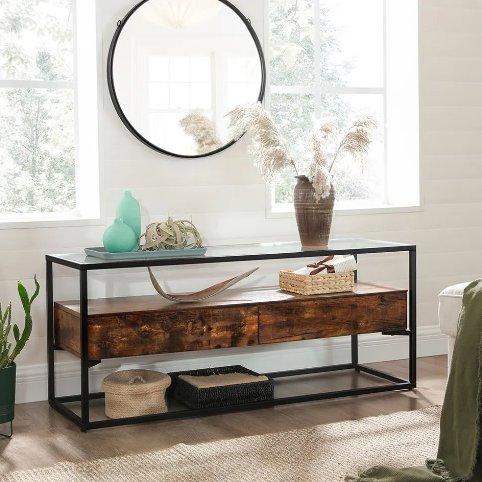 “WAOUH : Avec son verre transparent, ses lignes métalliques noires et ses panneaux marron rustique, ce support TV séduira tous vos invités qui vous complimenteront pour avoir choisi un meuble aussi parfait