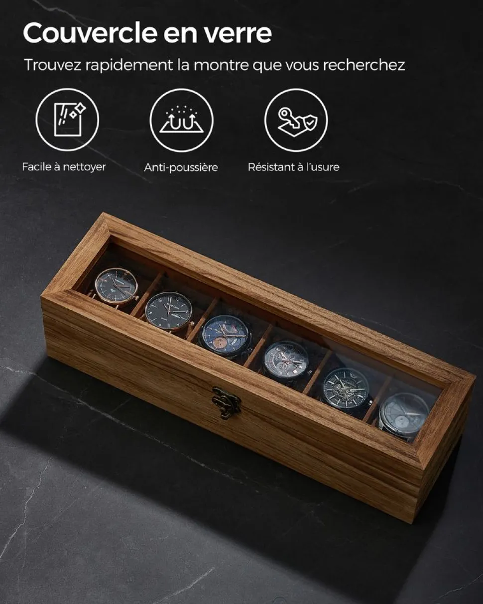 [Donnez du style à votre collection de montres] Grâce à son bois massif et à son couvercle en verre, cette boîte à montre ne sert pas qu’au rangement, il met aussi en valeur votre collection de montres. Elle ajoute même une touche déco à votre intérieur[Matériaux de qualité, protection totale] Avec son cadre en bois solide et son intérieur tout doux en velours, ce coffret protège vos montres des chocs et des rayures. Les coussinets moelleux mais fermes gardent vos montres en excellent état[Place pour 12 montres] Avec ses 12 compartiments, cet écrin vous permet de ranger vos montres dont le cadran va jusqu’à 51 mm et vous permet de trouver rapidement la montre adaptée à votre tenue[Couvercle en verre] Grâce à son grand couvercle en verre, vous pouvez exposer votre collection de montres, la protéger de la poussière, la retrouver facilement et choisir une montre sans avoir à ouvrir le couvercle[Magnifique cadeau] Que ce soit pour un anniversaire de naissance ou de mariage ou une fête, cette boîte à montres élégante et fonctionnelle est un merveilleux cadeau pour vos proches. Elle leur décrochera un sourire à coup sûr