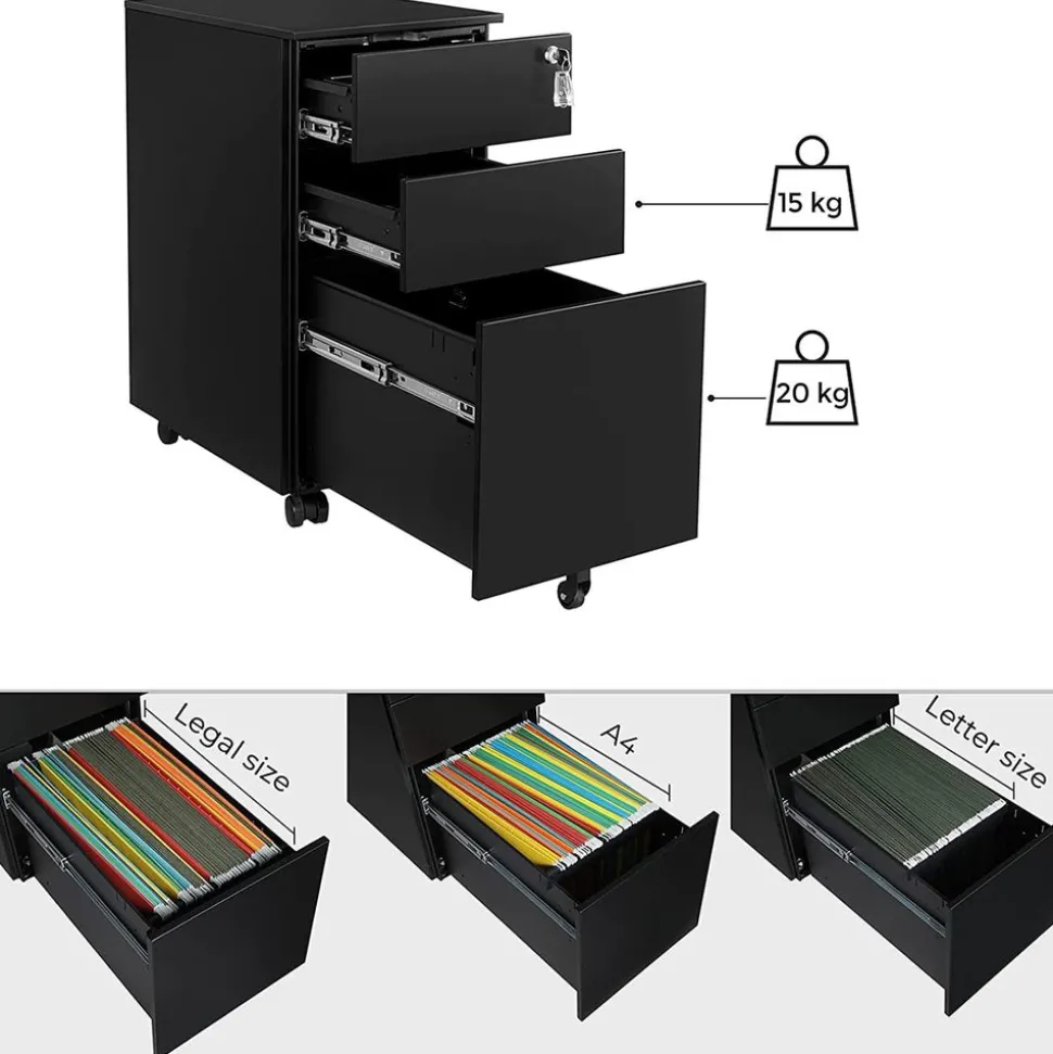[Tout au même endroit] Si votre lieu de travail ou bureau à la maison est sans dessus dessous, adoptez ce caisson à 4 tiroirs pour vous simplifier le rangement au quotidien. En plus, il dispose d’un plateau pour y mettre des trombones et des agrafes[Durabilité et capacité] Vous travaillez dur ? Et bien ce meuble de bureau avec une structure en acier et une capacité de 15 kg par tiroir est fait pour vous. Il est parfait pour ranger tous vos documents[Ouveture et fermeture pratique] Ce casier à roulettes est équipé de rails à grande extension pour ouvrir complètement ses tiroirs sans qu’il bascule. Il possède aussi une serrure pour protéger votre paperasse des mains indiscrets[Pré-assemblage] Ce casier arrive pré-assemblé pour vous faciliter la tâche ! Il suffit de visser les 4 roues (dont 2 avec freins) et le tour est joué ![Ce que vous obtenez] Un caisson à 4 tiroirs avec une serrure pour garder vos secrets en sécurité, 4 roulettes pour faciliter son déplacement, et une roulette supplémentaire pour plus de stabilité ; voilà plus d’espace de rangement à votre bureau !