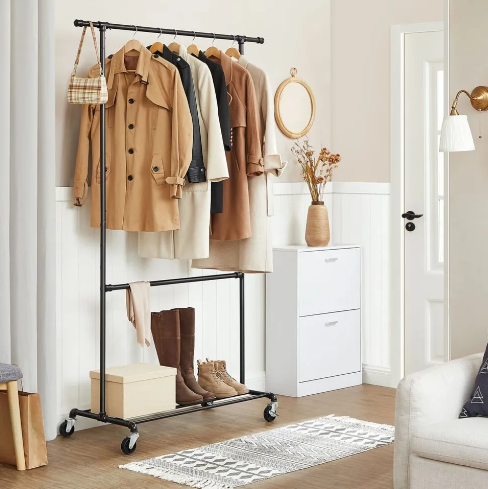 Ce design industriel et rétro rend ce porte-manteau SONGMICS décoratif, conçu pour le magasin de vêtements, les boutiques et les commerces de détail. La barre inférieure est réglable à 4 hauteurs donne d’une grande possibilité de présenter vos vêtements avec élégance et esthetisme. Les roulettes sont pratiques pour se déplacer aux alentours. Nous sommes en train de déposer une demande de brevet pour ce porte-manteau à double rail.Polyvalents dans les différents domaines