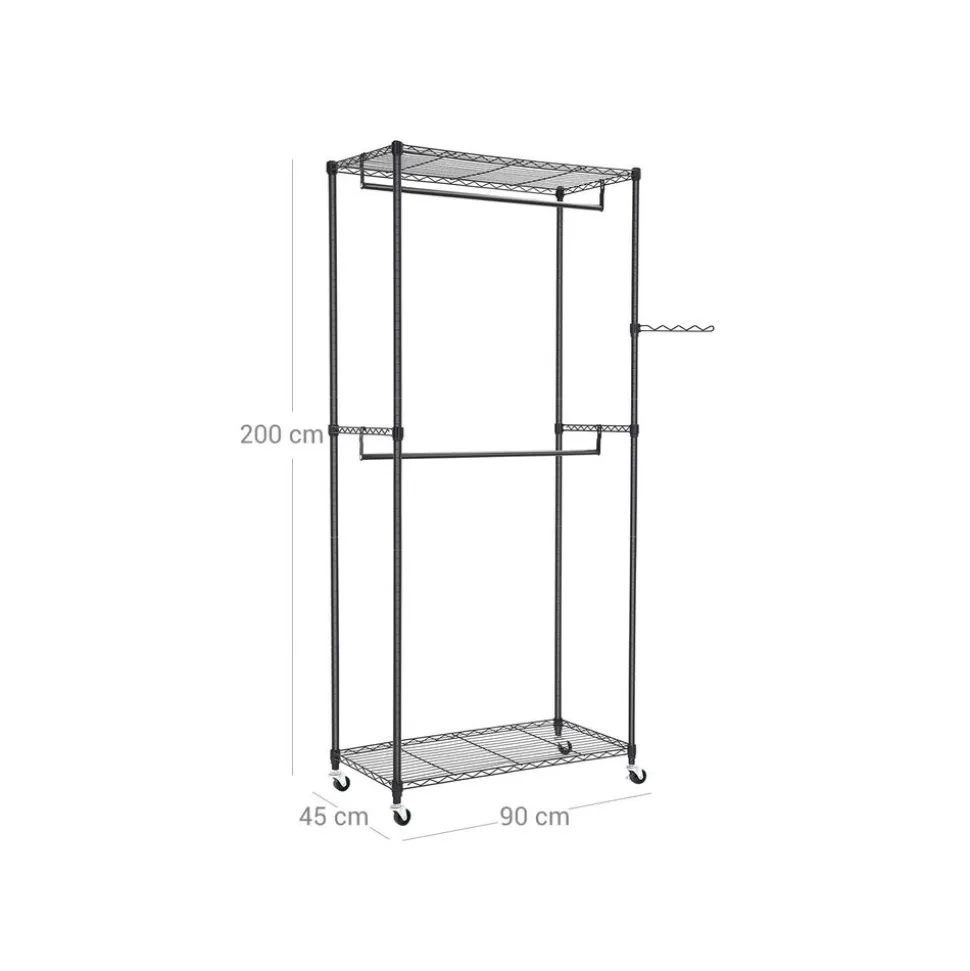 - Caractéristiques:Couleur: noirMatière: tube en ferPoids net: 8,4 kgDimension de produit: 90 x 45 x 200 cm ( L x l x h)Dimension d’emballage: 92 x 47 x 7,3 cmCharge maximale d’étagère: 40 kgCharge maximale de barre de penderie: 30-40 kgLivraisons:1 x Portant1 x Notice de montage (DE, FR, ES, IT, EN)