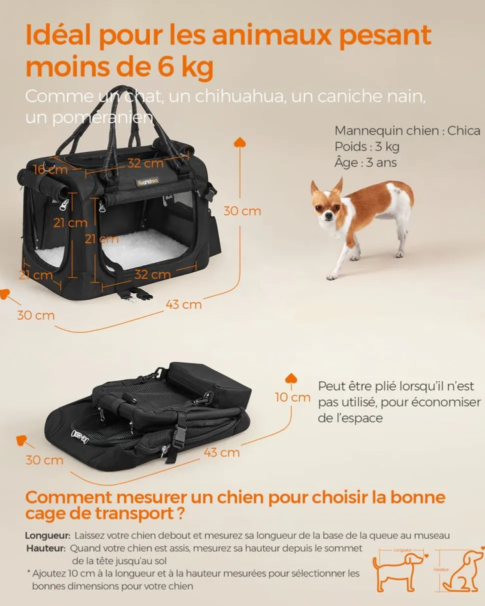 [Choisissez le bon sac] Ce sac de 43 x 30 x 30 cm convient aux animaux pesant jusqu’à 6 kg. Races recommandées : Chat, Chihuahua, Caniche Nain, Poméranien. Veuillez lire nos conseils indiqués sur les images pour choisir la bonne taille[Laisse incluse] La bandoulière est une corde d’escalade de 120 cm de long pour un diamètre de 1,2 cm avec un mousqueton en métal, elle peut être utilisée comme une laisse. Les bandes réfléchissantes assurent votre sécurité lors des promenades nocturnes[Sûr, confy et pratique] Cette cage est composée d’un cadre en acier et d’un tissu Oxford durable et hydrofuge. Avec ses filets respirants et son tapis en tissu imitation mouton amovible et facile à nettoyer, il est une niche stable et confortable[Adapté à tout type de voyages] Cette caisse pliable peut être placée sur le siège de la voiture, transporté en train ou attaché à la poignée d’une valise. Vérifiez auprès de la compagnie aérienne avant l’embarquement si vous pouvez l’emporter à bord[Portable, pliable] Cette caisse est pratique à emmener partout grâce à sa poignée et à sa bandoulière pratiques. Une fois pliée, elle mesure 43 x 30 x 10 cm et se glisse dans le coffre de votre voiture ou dans un coin