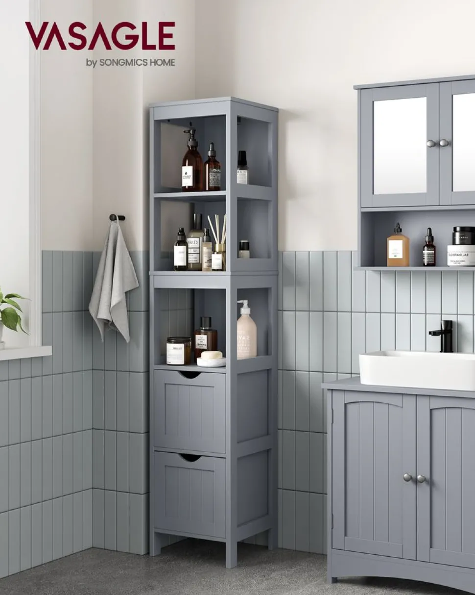 Ce que vous obtenez : Un meuble de salle de bain design et pratique. Voici une façon d’ajouter une touche de fraîcheur à votre salle de bain et de ranger vos affaires de manière ordonnée ![Précaution] Pour des raisons de sécurité, veuillez impérativement fixer le produit au mur avec le dispositif anti-basculement fourni
