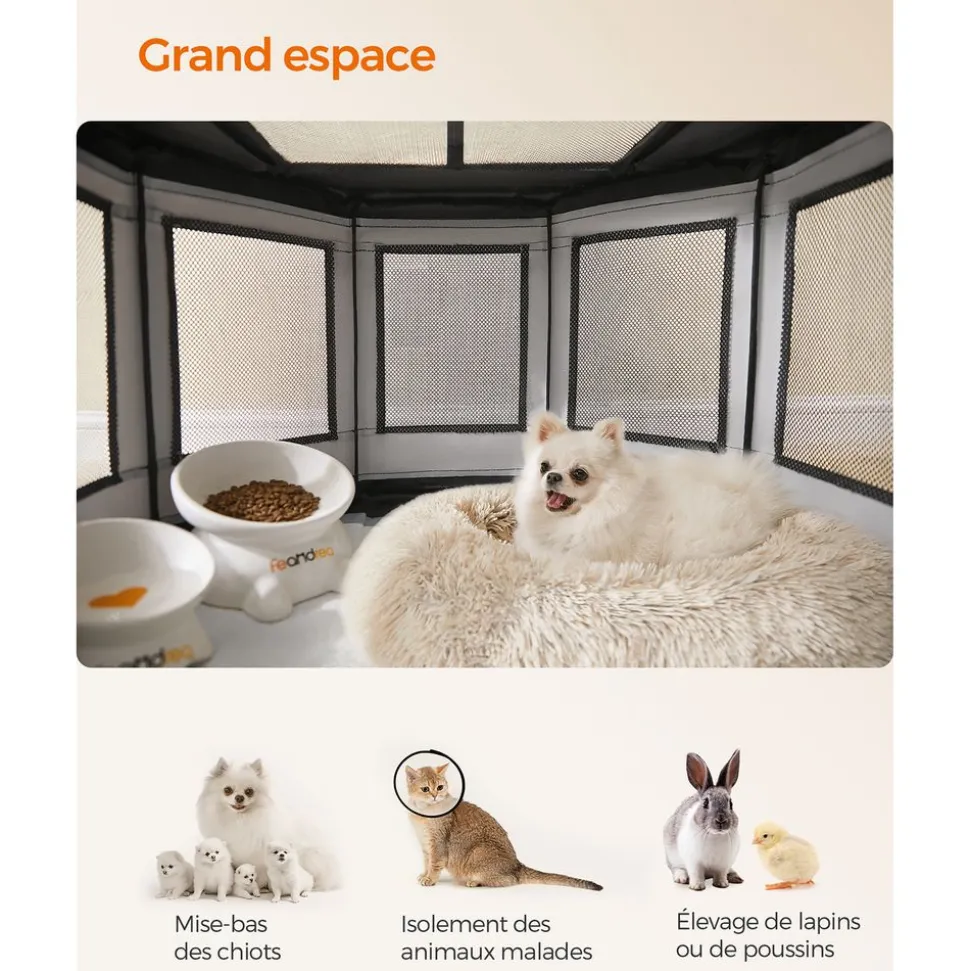 [Structure sûre] Cette clôture pour chiens est dotée d’un cadre robuste en tubes de PVC qui maintient la stabilité, même si votre chiot est très remuant à l’intérieur, il évite la déformation et sécurise l’environnement de votre animal[Résistant mais respirant] Les côtés de ce parc pour chien sont fabriqués en tissu Oxford 600D et en mailles serrées, résistants et durables, qui résistent aux morsures et aux coups de patte, la toile assure une bonne aération[Polyvalent] Cet enclos s’ouvre à l’aide d’une fermeture éclair en haut et sur un côté, il peut être un espace interactif ouvert ou un espace fermé et sûr. Doté d’une pochette, il est idéal comme niche, séparation, cage de mises-bas ou lieu de soins…[Large espace] Ce chenil de 72 x 72 x 43 cm convient aux chats et chiens de petite taille jusqu’à 11 kg comme le Yorkshire, le Poméranien, le Carlin, le Chihuahua, le Caniche nain, le Corgi, le Bouledogue français… Choisissez selon votre animal[Facile à nettoyer] Le fond de cette niche pour chien est hydrofuge, vous pouvez donc le nettoyer avec un chiffon ou un aspirateur, c’est un espace pratique à garder propre et hygiénique pour vous et votre animal