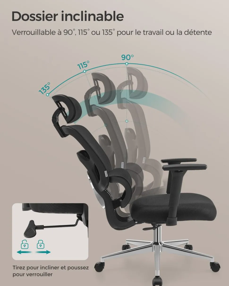 【Robuste et stable】Avec son vérin à gaz de haute qualité et sa base en métal robuste, cette chaise de bureau supporte jusqu’à 120 kg et offre un maintien solide et stable