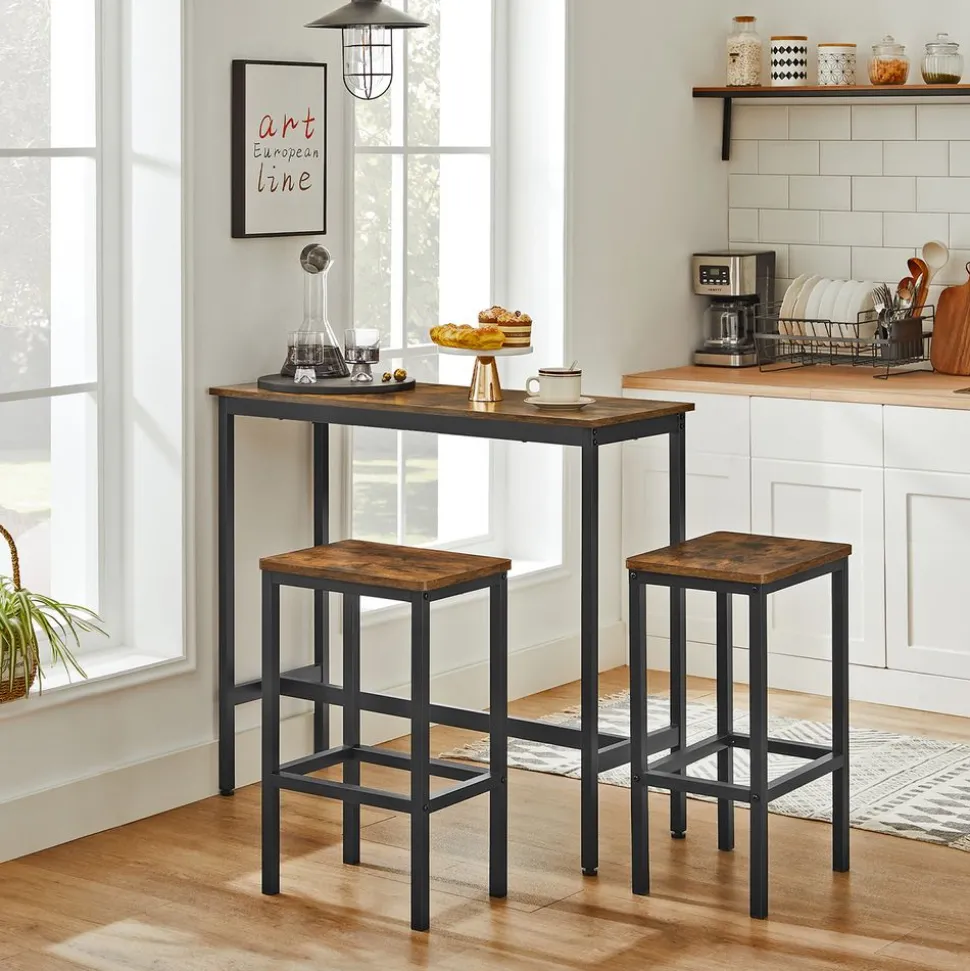 Créez un coin petit-déjeuner : Cette table haute de 100 x 40 cm est assez grande pour accueillir votre café, votre croissant et votre jus de fruit. Les 2 tabourets de 40 x 30 cm permettent à 2 personnes de prendre confortablement leur petit-déjeuner