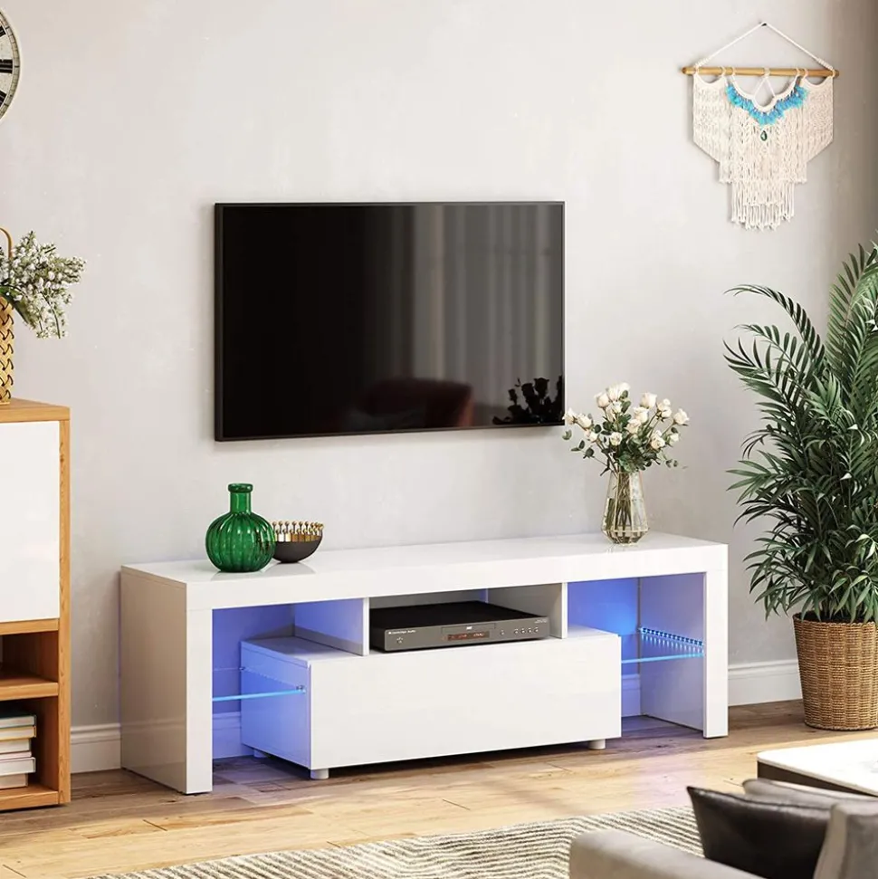 BANDES LUMINIEUSES À LED : Mettez votre téléviseur en lumière avec la surface blanche brillante de ce meuble TV et donnez une touche de modernité à votre coin TV. Collez les deux bandes lumineuses fournies n’importe où sur le panneau du téléviseur et laissez-le briller dans des couleurs vives néon