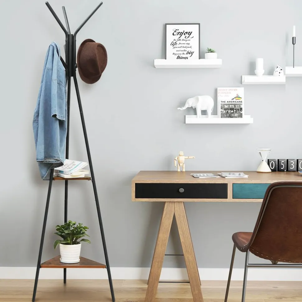 Stabilité avant tout : Fabriqué en métal et en panneaux de fibres épais, ce porte-manteau est durable et stable. Le piètement tripode assurent une excellente stabilité. Capacité de charge: 5 kg/patère, 10 kg/étagère.