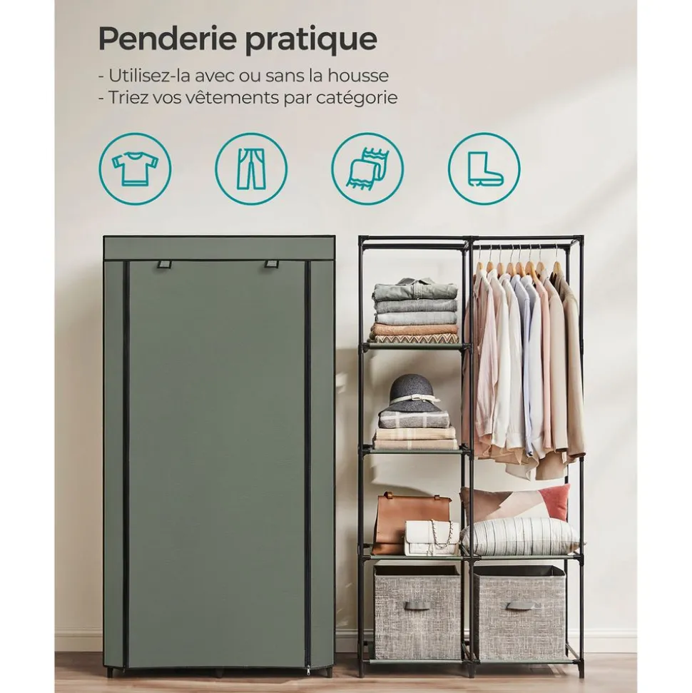 Grâce à cette garde-robe en tissu, vous n’avez plus à chercher la tenue adéquate dans des piles de vêtements. Voilà comment économiser beaucoup de temps et d’efforts le matin. Cette armoire est équipée de 2 tringles à vêtements où vous pouvez accrocher vos vêtements. Avec elles, ils restent ordonnés et à portée de main.Caractéristiques :