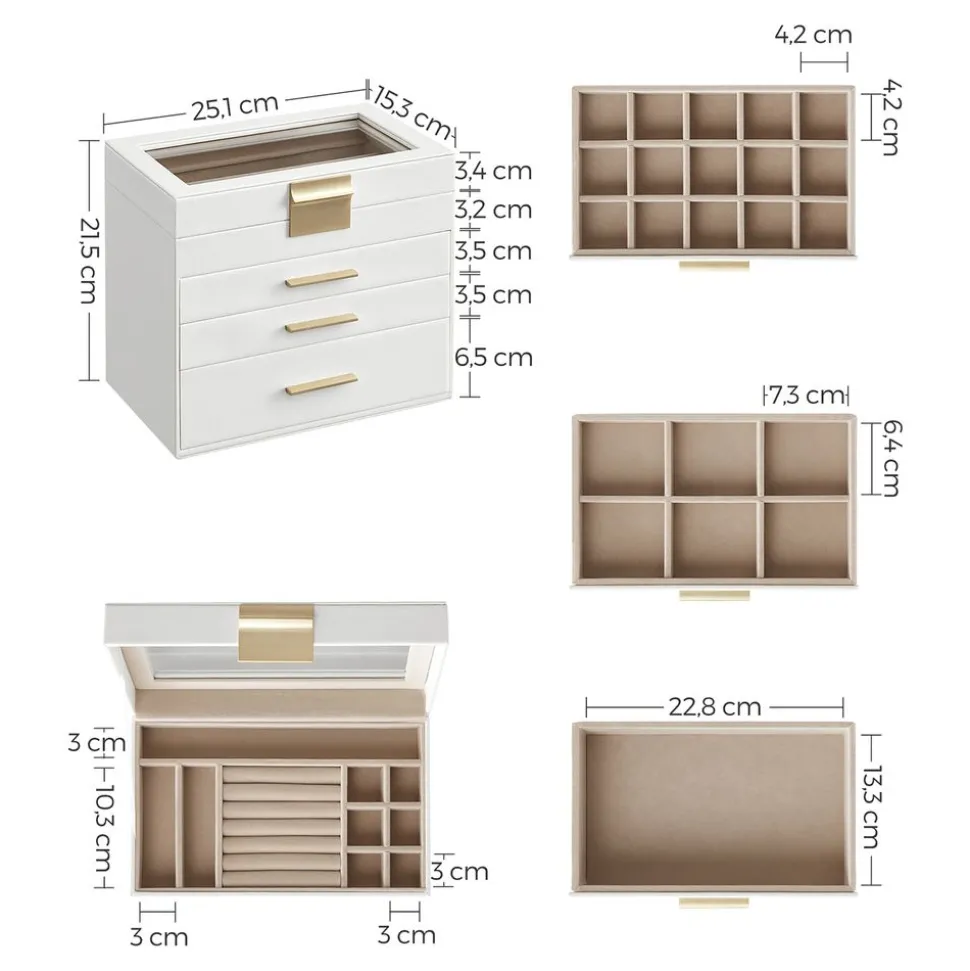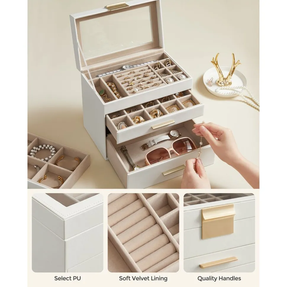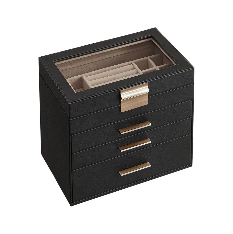 Du rangement, 4 niveaux : Rangez vos accessoires de manière ordonnée dans cette boîte à bijoux ! Les petits bijoux sont rangés dans les compartiments de différentes tailles, les lunettes de soleil et les montres sont dans le grand tiroir du bas