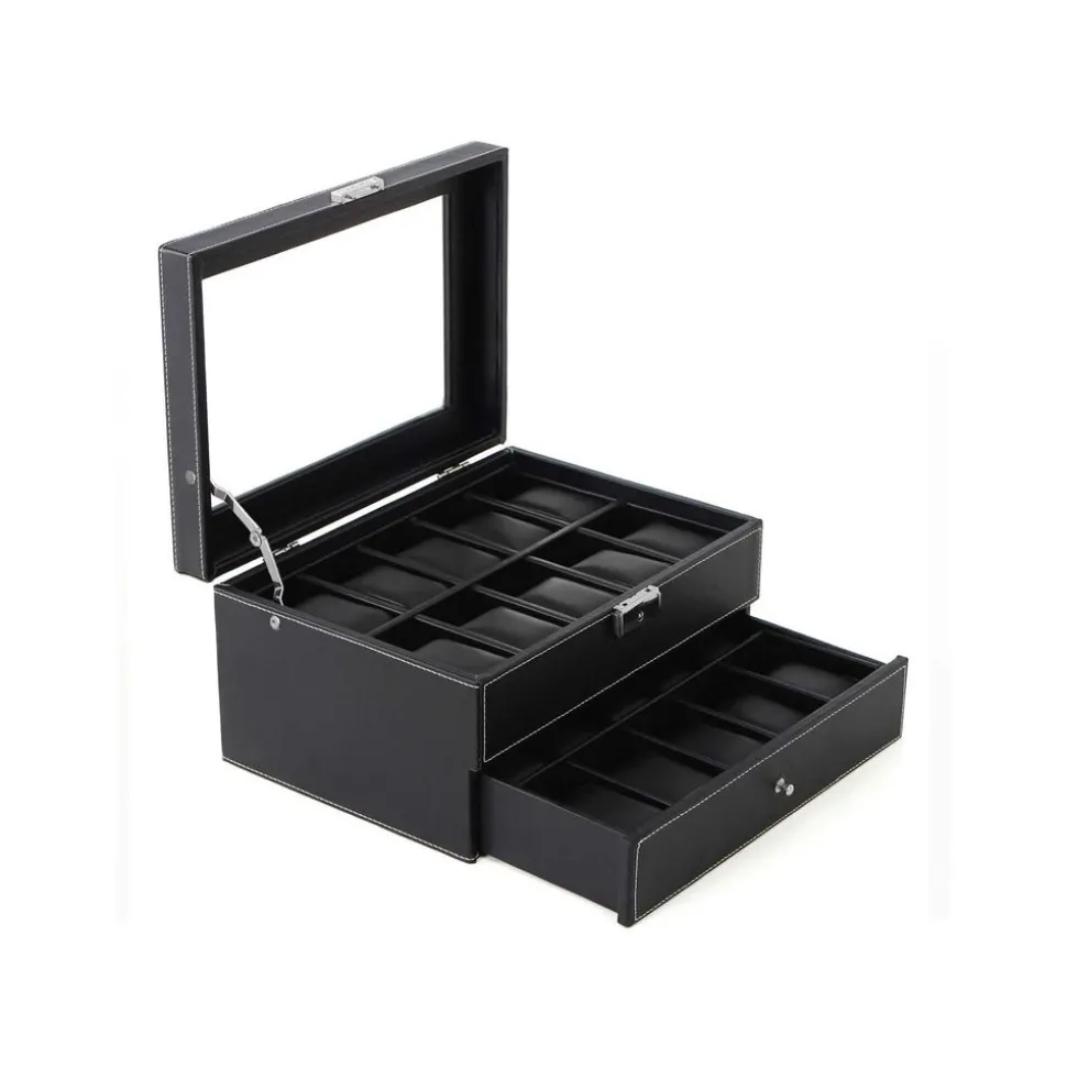 Design classique – Par la vitre au couvercle, elle peut présenter parfaitement votre montres et bijoux favoris. Apparence classique et élégante avec des surpiqûres blanches