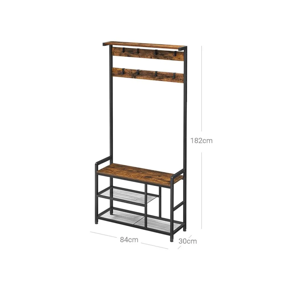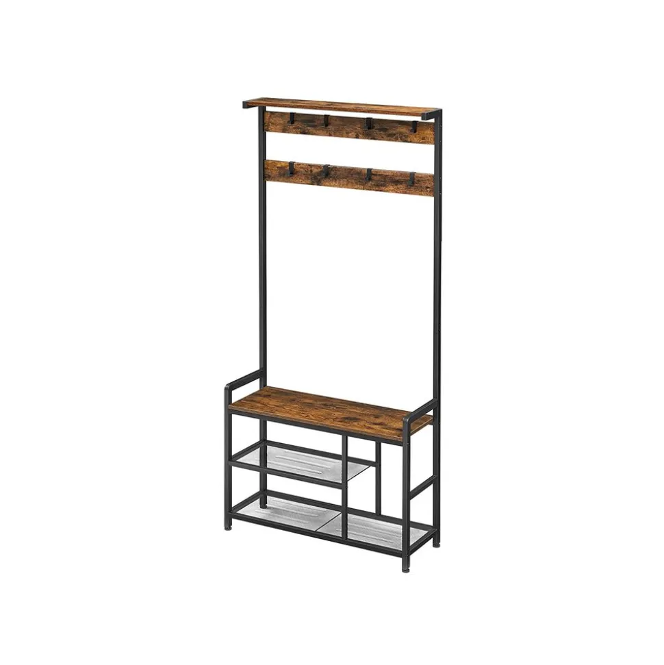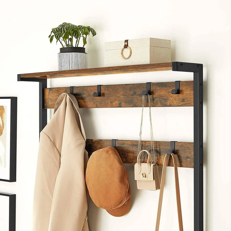 Quelques éléments rustiques : Le cadre en métal noir et les panneaux d’aggloméré marron rustique sont un mélange original. Ce portemanteau de style industriel embellit votre intérieur