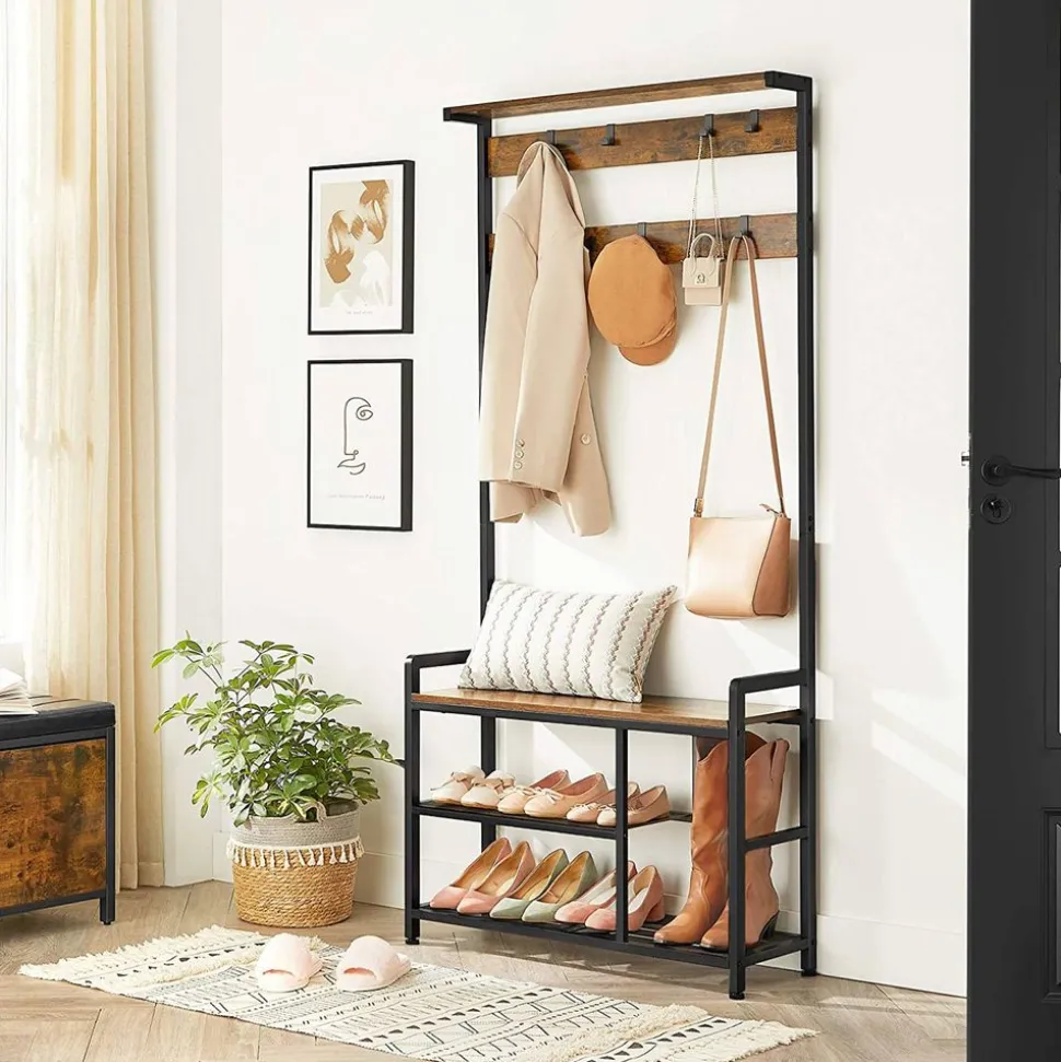 Ce que vous obtenez : Un portemanteau tout-en-un avec des crochets et un banc à chaussures pour créer une entrée plus accueillante et offrir de quoi s’asseoir pour mettre ses chaussures. Ce vestiaire fait partie de la Collection ALINRU