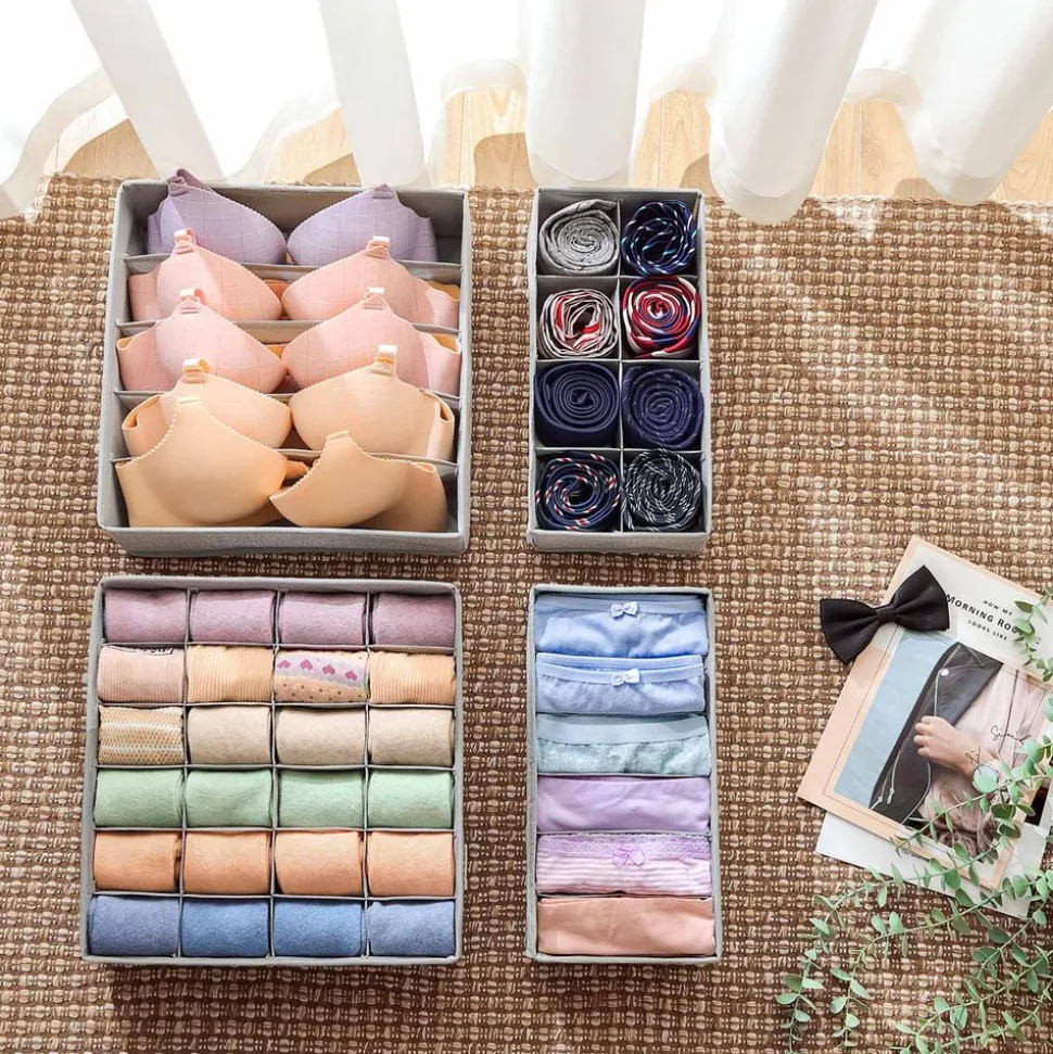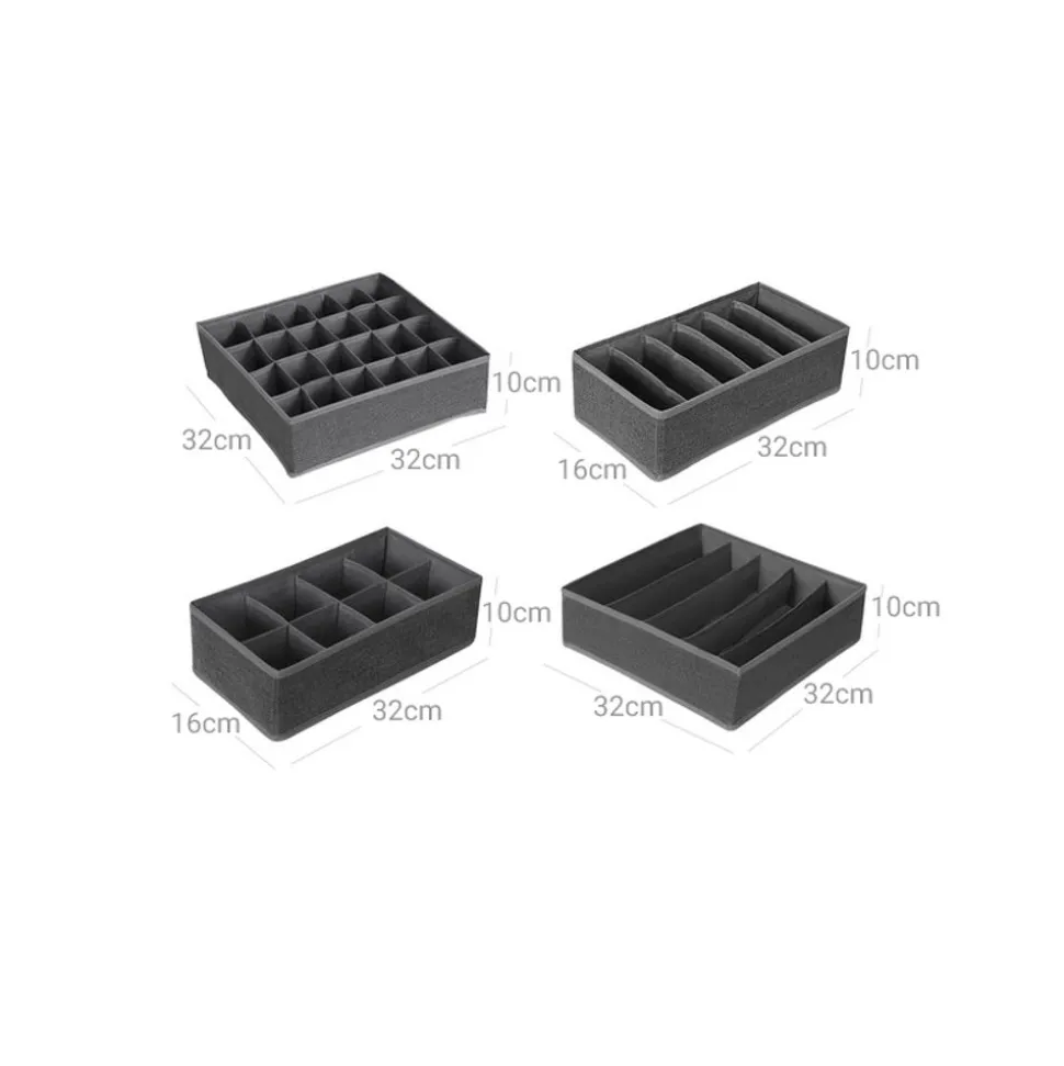 BIEN ORGANISÉ AU MILIMÈTRE PRÈS: Ce lot de 4 organisateurs répond astucieusement à tous vos besoins de rangement. Un produit à 5 compartiments (32 x 32 x 10 cm) pour des soutiens-gorge, un produit à 6 compartiments (32 x 16 x 10 cm) pour des écharpes ou des culottes, un produit à 8 compartiments (32 x 16 x 10 cm) pour des cravates et un produit à 24 compartiments (32 x 32 x 10 cm) pour des chaussettes ou de petits articles