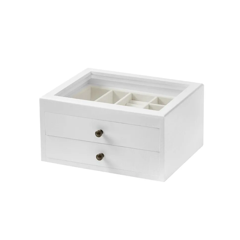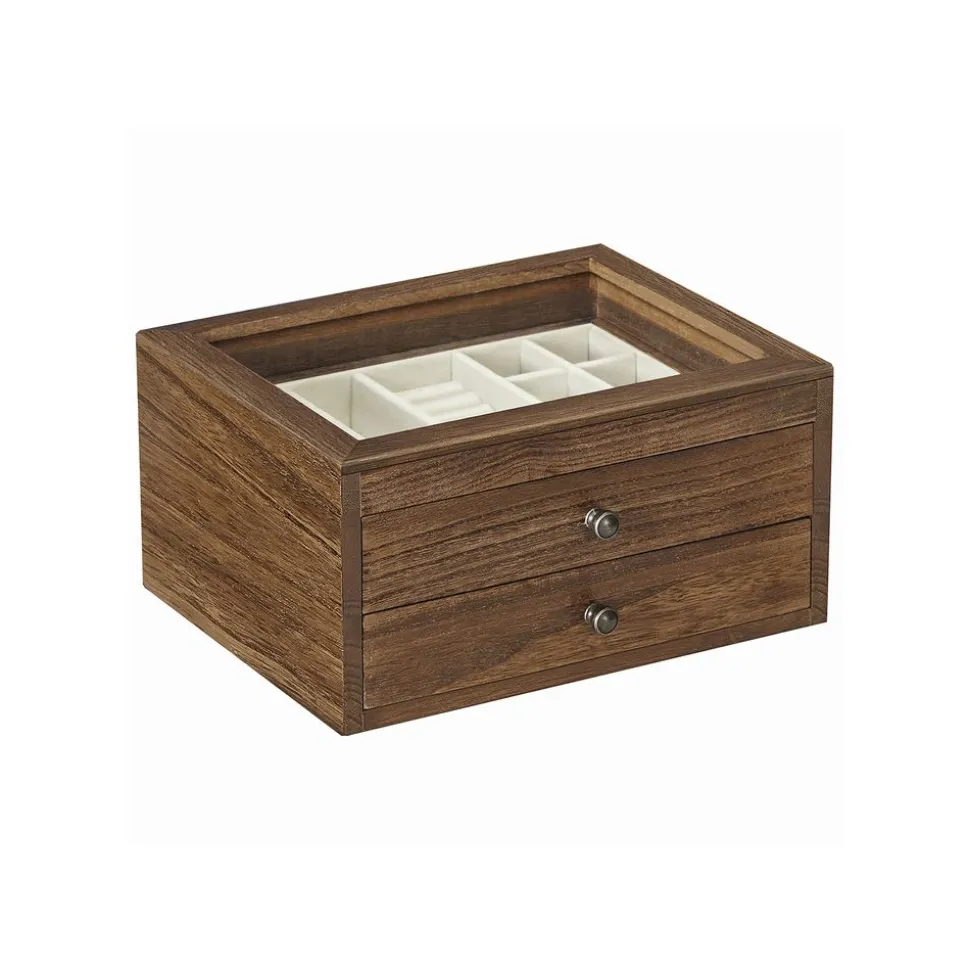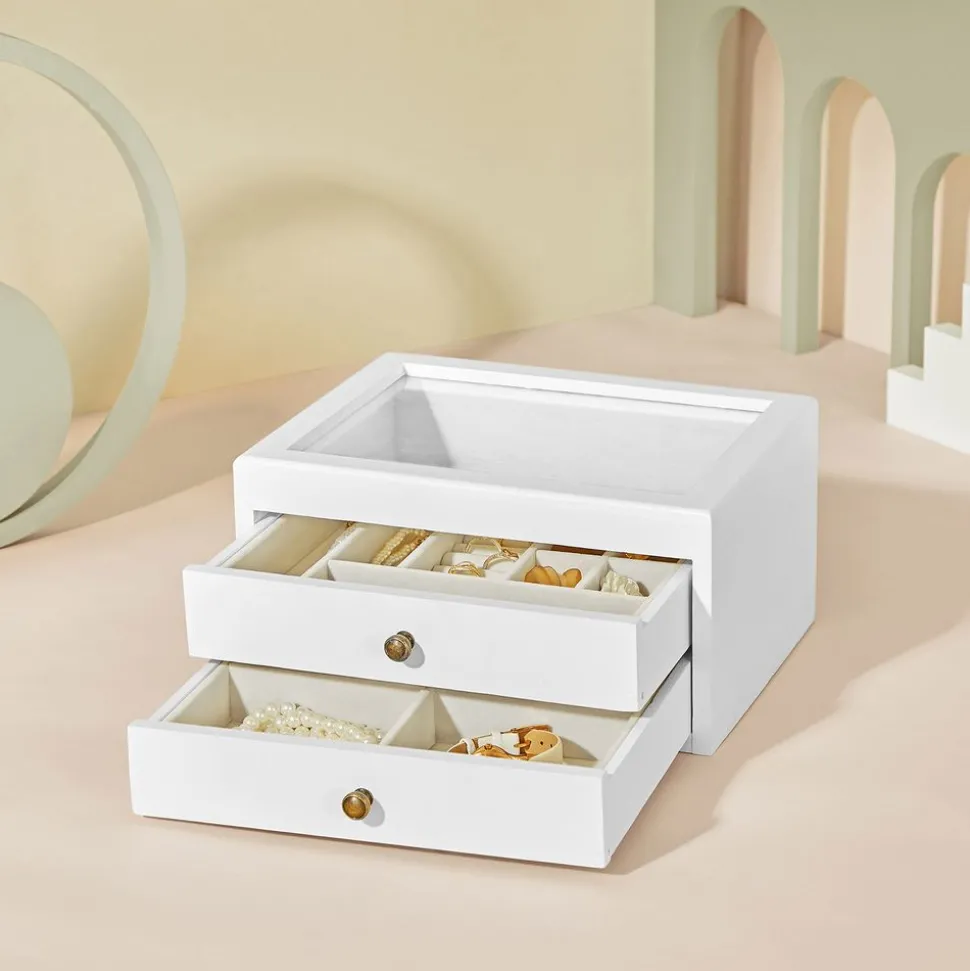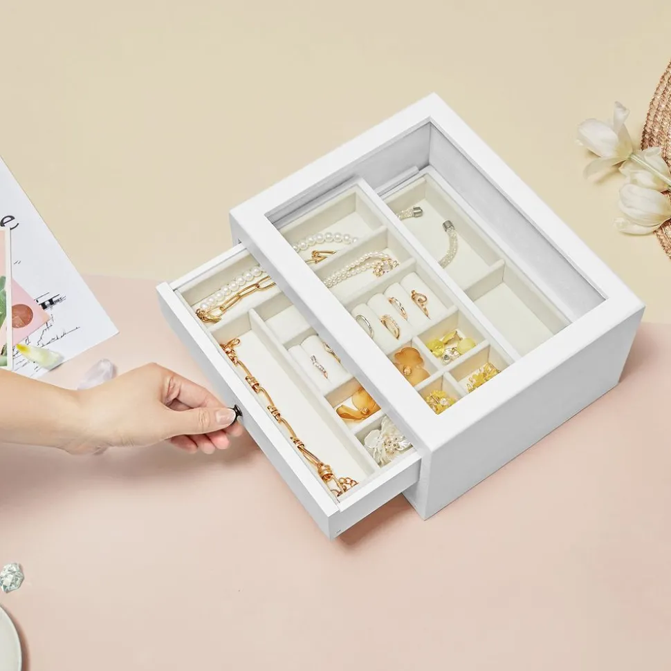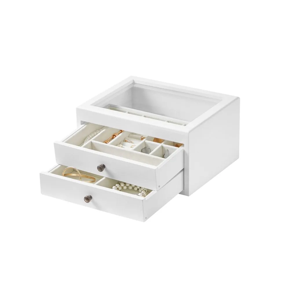 Ce que vous obtenez : Une boîte à bijoux SONGMICS avec un couvercle en verre et 2 tiroirs. Voilà une solution intelligente pour garder vos bijoux précieux bien rangés !