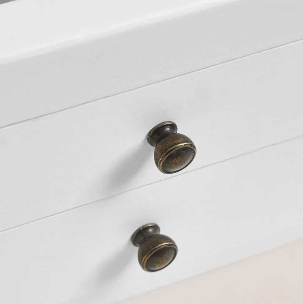 Plus de beauté : Apportez une touche d’élégance à votre coiffeuse avec cette boîte à bijoux aux finitions blanches. Le plateau en verre transparent ajoute un charme supplémentaire tout en vous permettant d’exposer fièrement votre collection de bijoux étincelants