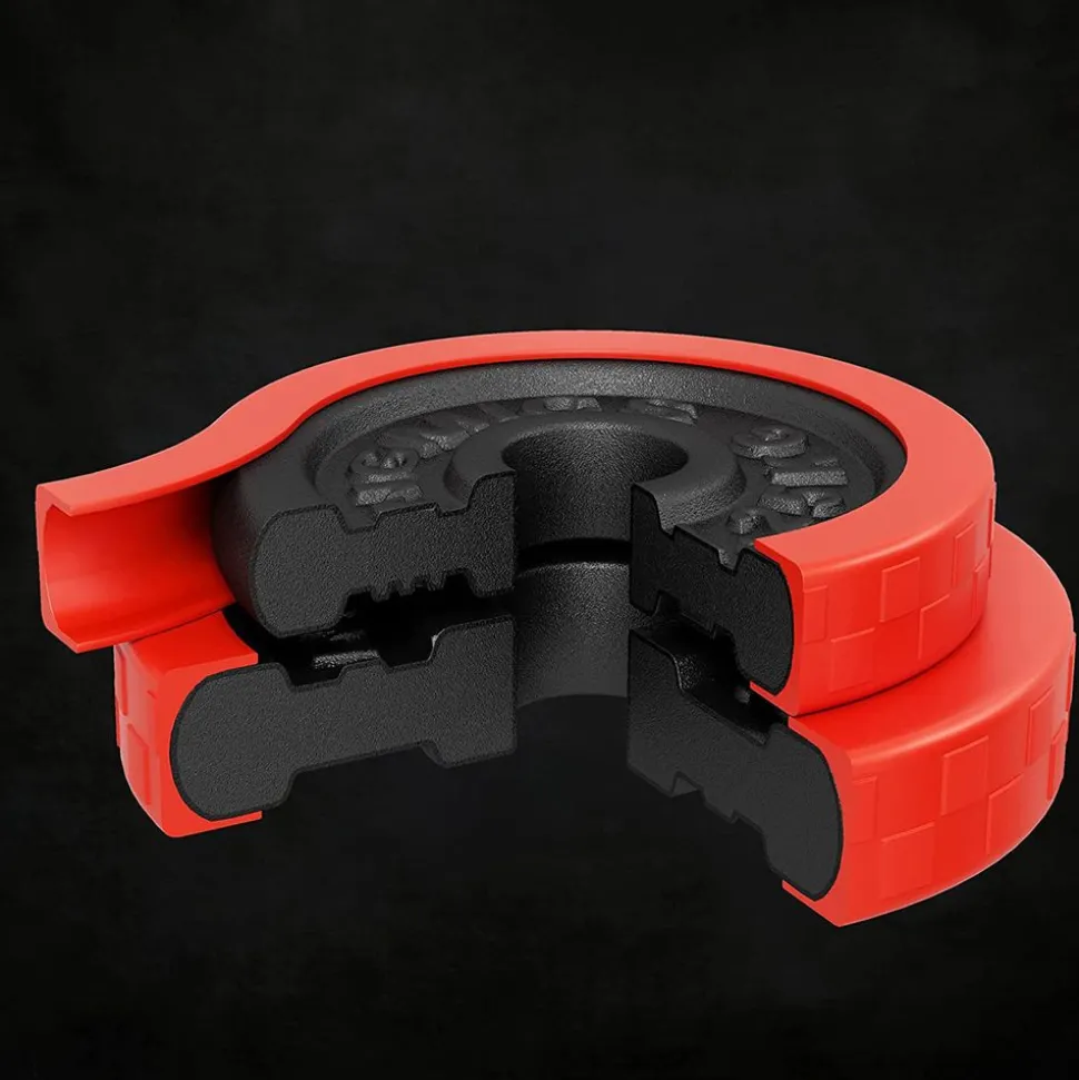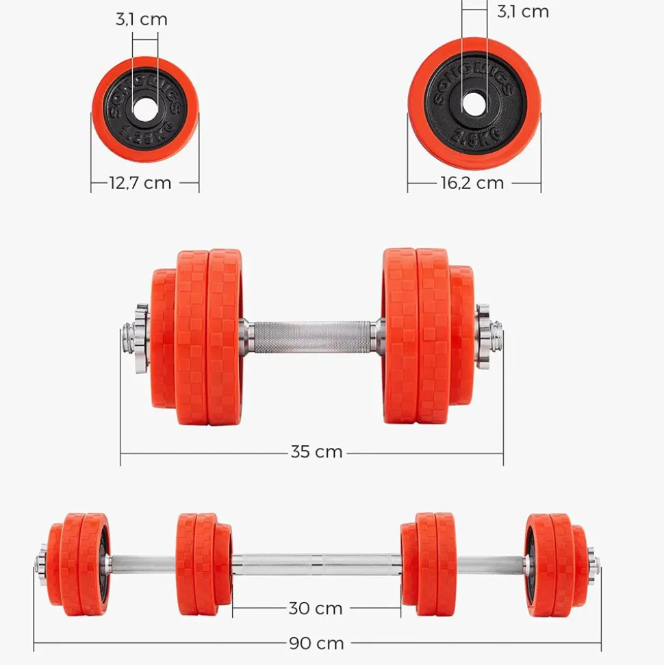 Matériaux : Poignées d’haltère en acier recouvert de plastique, barre d’extension en acier recouvert de mousse, protection de disque en PVC, coque de disque en acier traité par poudrage, rembourrage de disque en mélange de fer, sable et ciment, verrou en plastique polypropylène