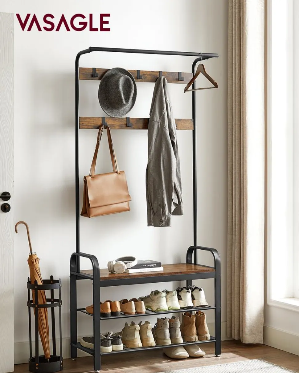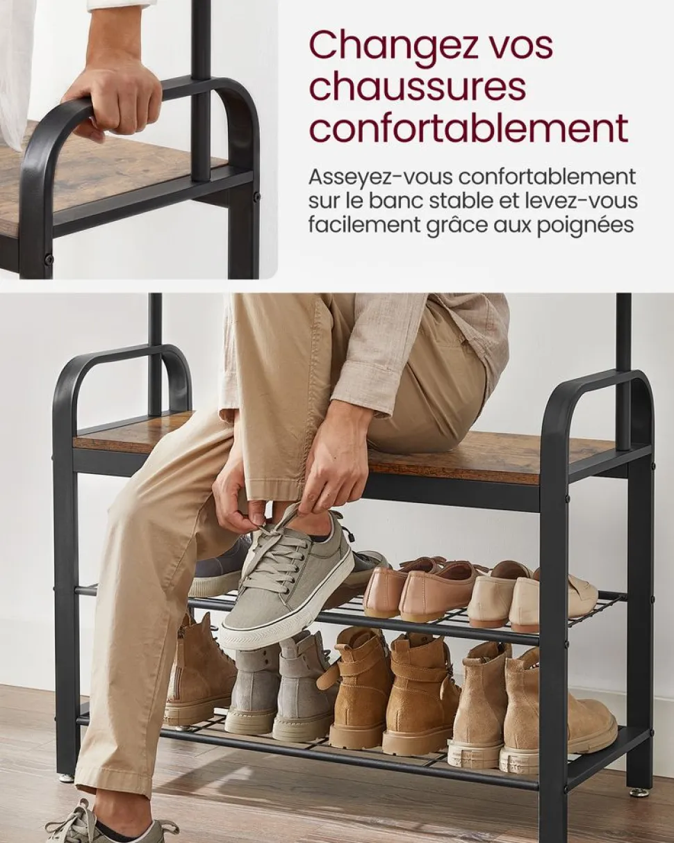 Paradis pour chaussures : Voilà 9 crochets et 1 tringle dans la partie supérieure et une étagère à 2 niveaux pour les chaussures en bas. Asseyez-vous sur le banc et mettez vos chaussures confortablement avant de partir !
